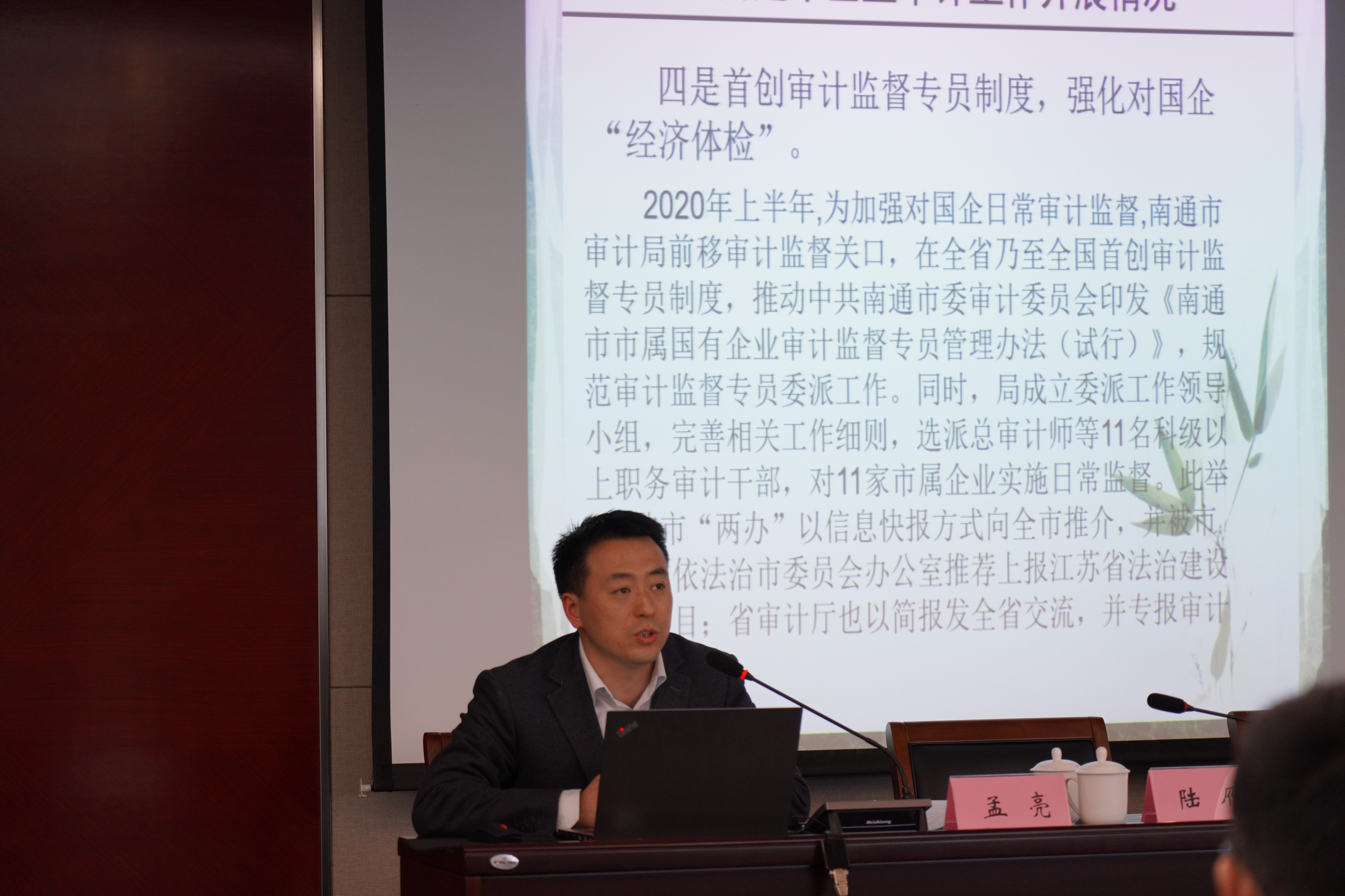 企業(yè)審計(jì)處處長孟亮,為大家作《國有企業(yè)審計(jì)簡介》講座,他結(jié)合實(shí)際案例著重介紹了南通企業(yè)審計(jì)開展情況、國有企業(yè)審計(jì)的發(fā)展和總體要求、國企領(lǐng)導(dǎo)經(jīng)濟(jì)責(zé)任審計(jì)的方法和重點(diǎn)、做好國企領(lǐng)導(dǎo)經(jīng)濟(jì)責(zé)任審計(jì)的關(guān)鍵點(diǎn)等方面。