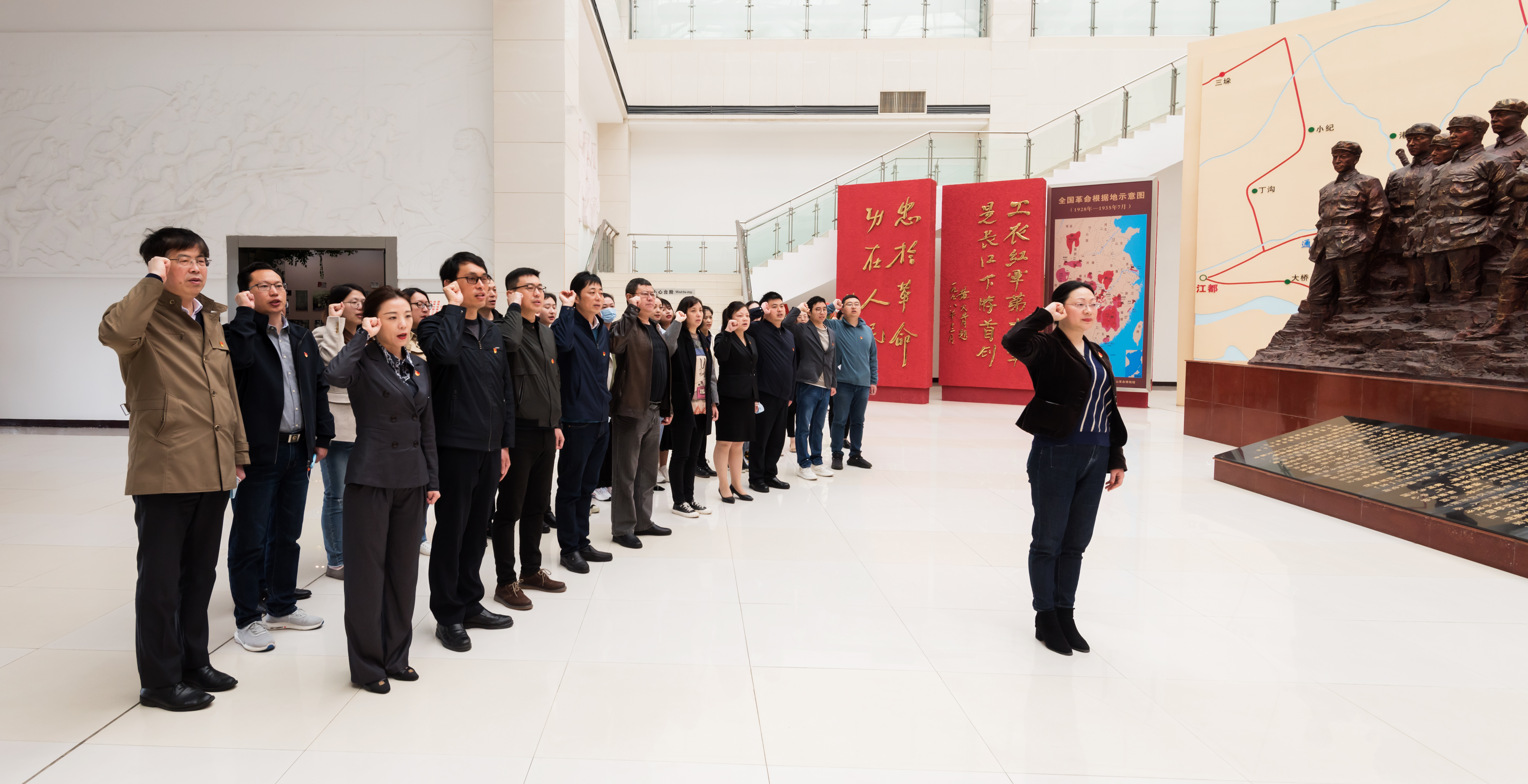 紅十四軍將士群雕前,全體黨員干部們整齊列隊,舉起右拳,向鮮紅的黨旗重溫入黨誓詞,深切表達為黨的事業(yè)奮斗終身的堅定決心。